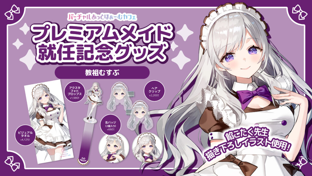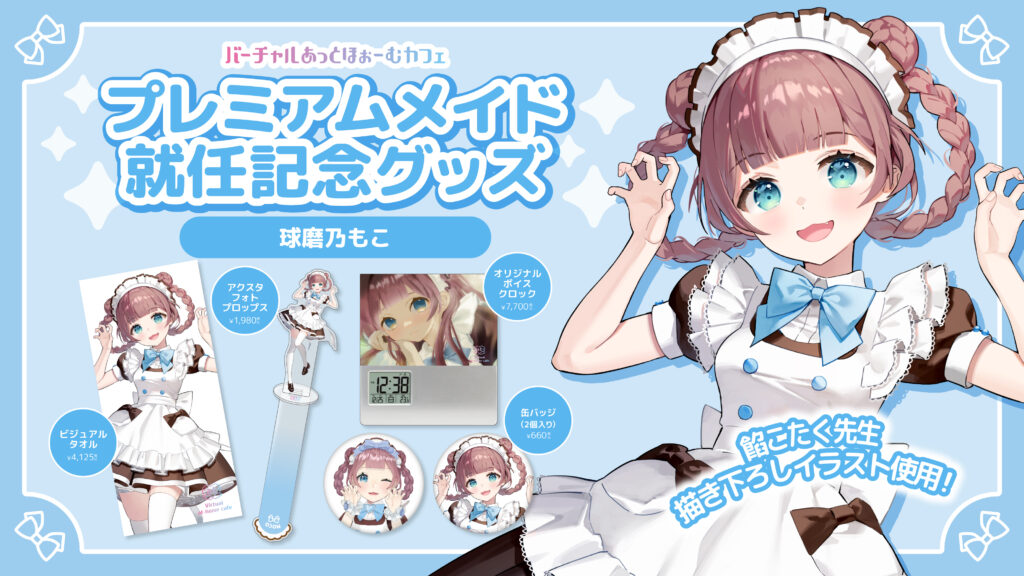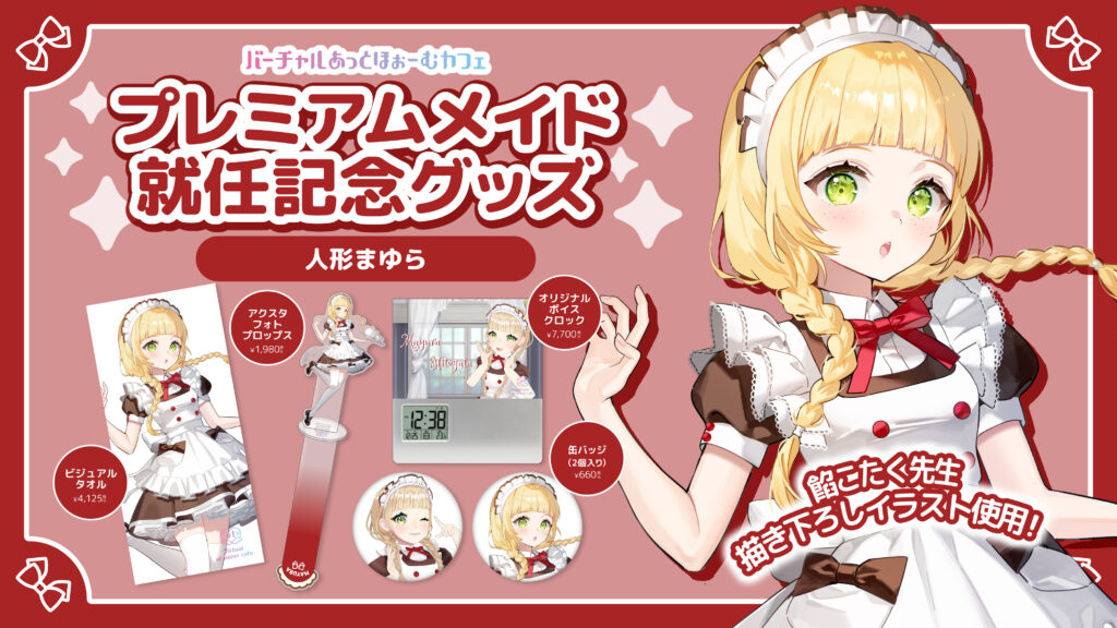 大変お待たせいたしました!バーチャルあっとほぉーむカフェのプレミアムメイド就任記念グッズの発売が決定いたしました!