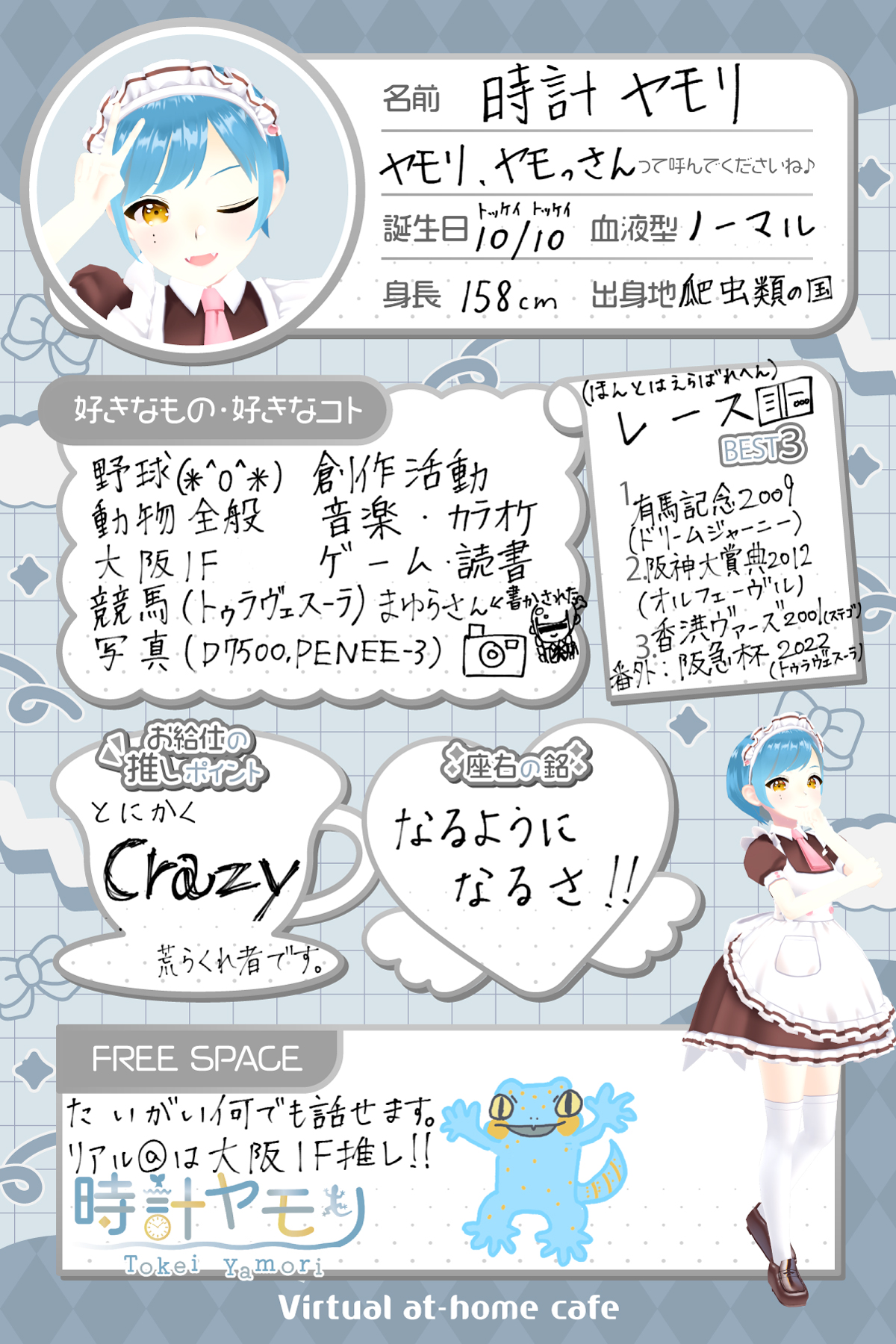 見習いメイド 時計ヤモリ 2025 9/24 プロフィール お給仕スケジュール 10月26日(日) 22:00~26:00 SNS・メディア Twitter Follow https://twitter.com/intent/follow?screen_name=vmaid_yamori 【スタイル】ワイワイ話したい 【タイプ】ファニー 【トーク】話し上手 【性格】元気 アニメ オタク お寺神社巡り お笑い お絵かき お菓子 カラオケ かわいいもの グルメ ゲーム サブカルチャー サンリオ スーパーポジティブ ソシャゲ ハンドメイド フィギュア ボーイッシュ マイペース マンガ よく眠る リアルあっと 写真 動物 多趣味 方言 旅行 映画 歌うこと 水族館巡り 爬虫類 自転車 野球観戦 URLをコピーしました!